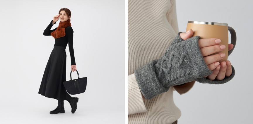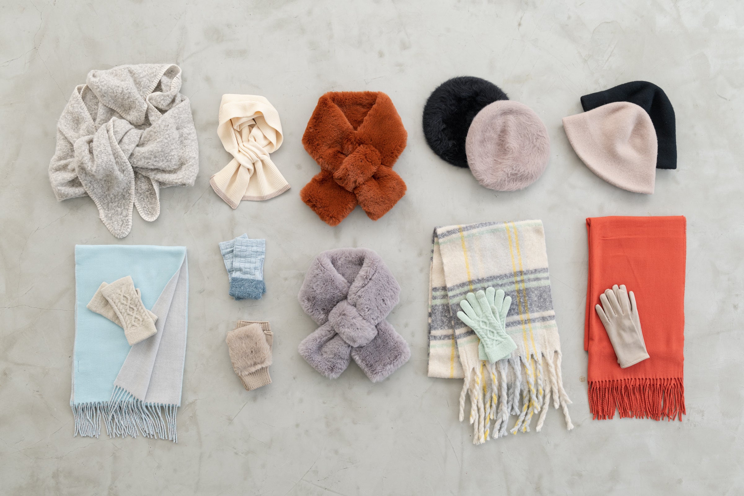 肌寒い気候になった今日この頃、冬に向けてマフラーや手袋などの防寒グッズを探している方も多いのではないでしょうか。KEYUCAでは、一人ひとりのライフスタイルや好みの洋服が違うように、小物も自分に合ったものを選んでほしいという想いから、さまざまなバリエーションのアイテムをお求めやすい価格で企画しました。冬の装いを彩るファーやニットから、春先も活躍する薄手のストールまで、カラーも豊富にそろえています。また、自宅で洗濯ができたり、抗菌防臭機能がついていたりと、イージーケアもポイント。冬の小物にありがちな、お手入れのわずらわしさもありません。さらに、かぶったままヘアケアができる帽子や、着用したままスマートフォンの操作ができる手袋、静電気防止機能のついたマフラーなど、“あったら嬉しい機能”もプラス。暮らしの中での使いやすさを追求しました。