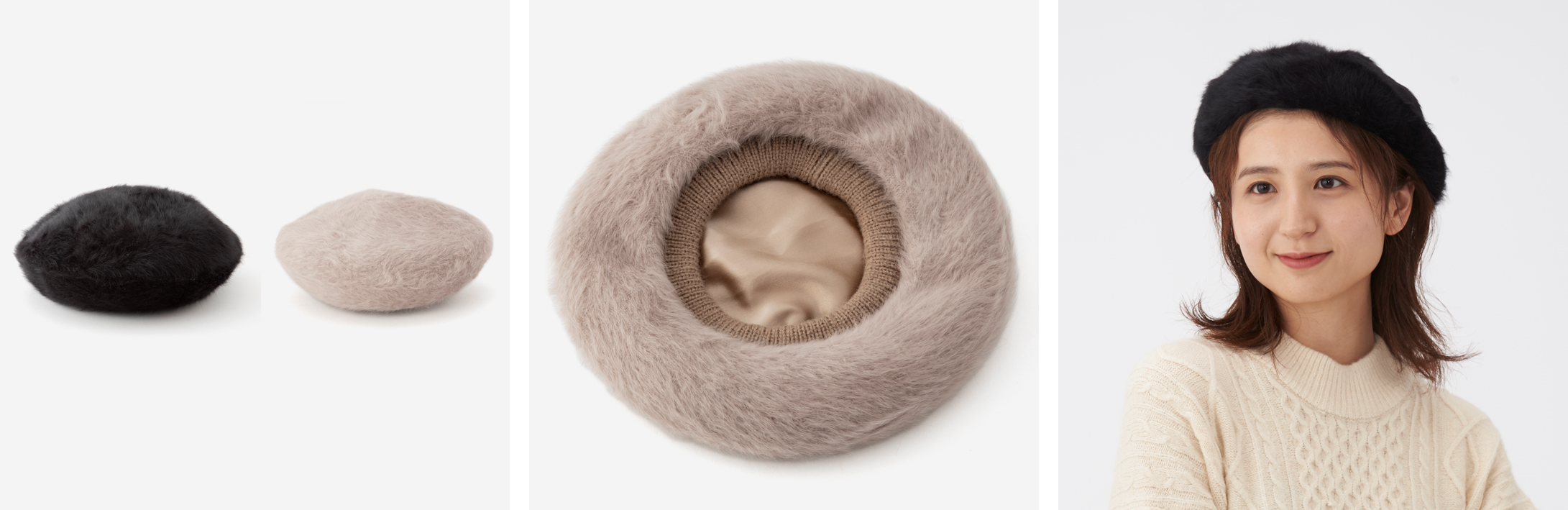 | ナイトキャップのように「外でもヘアケアをしたい!」という声を受けて登場した、おしゃれをしながら髪もケアできるベレー帽。内側にシルク100%の生地を使用しているため、帽子をかぶっている間の摩擦を抑え、髪の痛みを予防します。外側はファー素材で秋冬らしいデザインながらも、頭周りはストレッチ性のあるニット素材を使用しているため、かぶりやすくフィット感があるのもポイント。一つで二役をこなす、冬のコーディネートを華やかにするアイテムです。 |