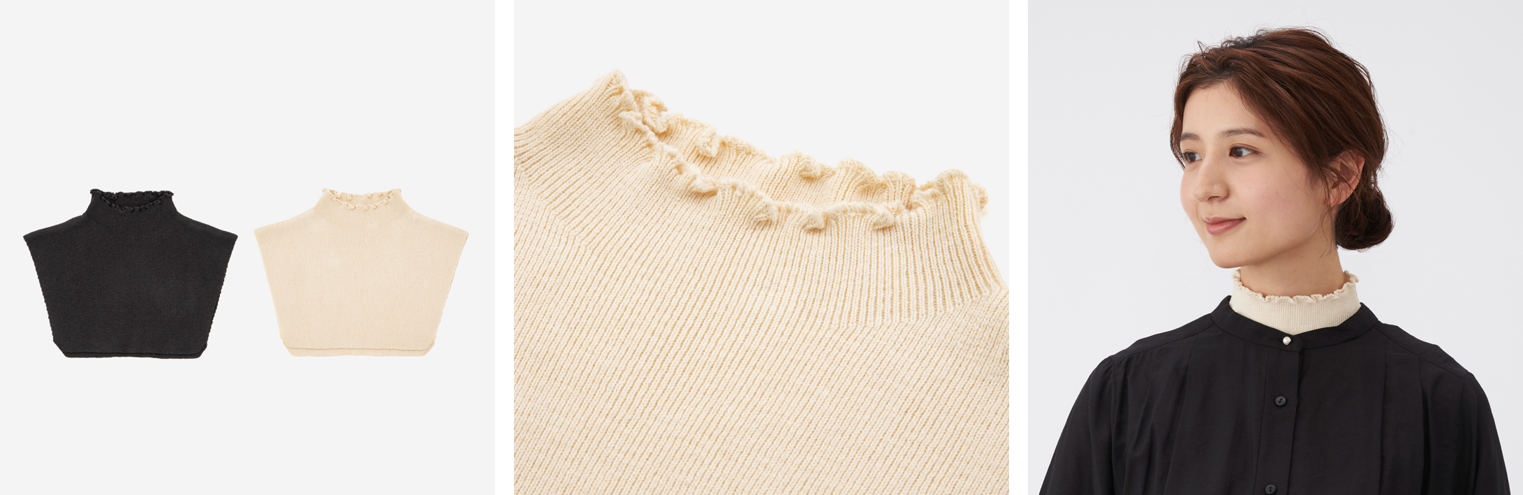 | 服の下に着用し、首元を温めてくれる洗える付け襟。まるで重ね着をしているような見た目のため、外出時はもちろん、室内でも活躍します。薄手かつストレッチ性のある素材で、着用の際にかさばりにくく、お化粧崩れの心配もありません。また、小さくコンパクトにたためるため、外出時にバッグに忍ばせておくことも可能です。ファッション性と機能性を兼ね備えたアイテムです。 |