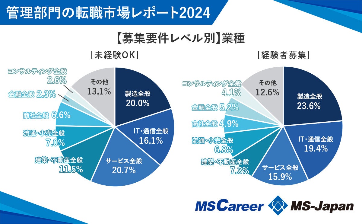 「経験者募集」は前述した順位と同様で、最多が「製造全般」の23.6%、「IT・通信全般」が19.4%、「サービス全般」が15.9%と続きました。