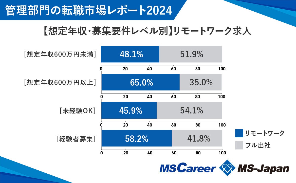 また、募集要件レベル別に見ると、「未経験OK」では45.9%、「経験者募集」では58.2%と、募集要件レベルによってリモートワークの導入率に差があることが分かります。