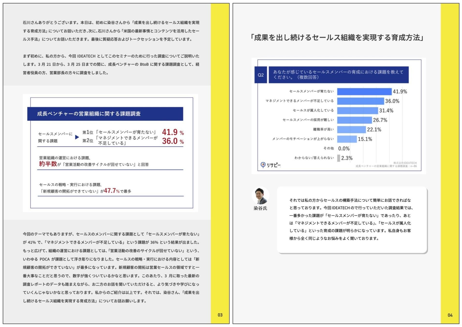 ファクトに基づいたコンテンツ開発とマーケティング支援を行う、株式会社IDEATECH(本社:東京都港区、代表取締役社長:石川友夫)が、株式会社Leader Partners(本社:東京都渋谷区、代表取締役:染谷 滉二)と共催した「BtoB企業必見!2年で売上0から10億円まで導いたセールス構築実践手法論公開〜米国で実践されるコンテンツセールスも合わせて公開〜」と題するオンラインセミナーは、成果を出し続けるセールス組織を実現する育成方法や、米国の最新事情とコンテンツを活用したセールス手法の紹介により、参加者の新たな視点に繋がる有意義なイベントとなりました。