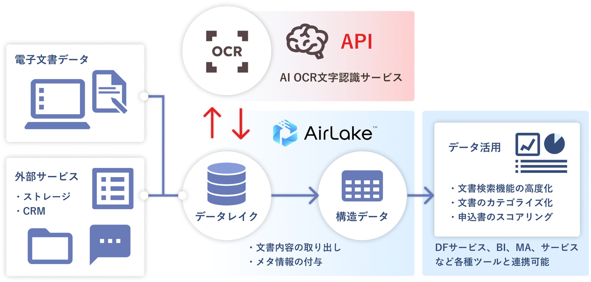 本ソリューションは、業界最高水準の高い認識精度(※2)をもつ東芝デジタルソリューションズのAI OCR技術と、ノーコードで非構造化データを変換するDATAFLUCTのデータ基盤「AirLake」の連携により、紙書類のデジタル化に留まらず、データ活用までシームレスに実現します。