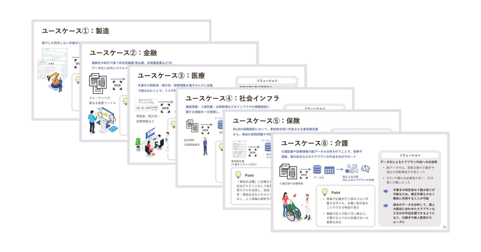 本資料では、調査でAI OCRのニーズが大きかった業界を中心に、AI OCRのユースケースをまとめました。活用できるデータの例と、読み取ったデータの分析方法、業務への活用方法を掲載しています。これまでAI OCRによる読み取りや活用が難しかったフォーマットのデータにも焦点を当て、本ソリューションを用いた新たな活用アプローチを解説します。