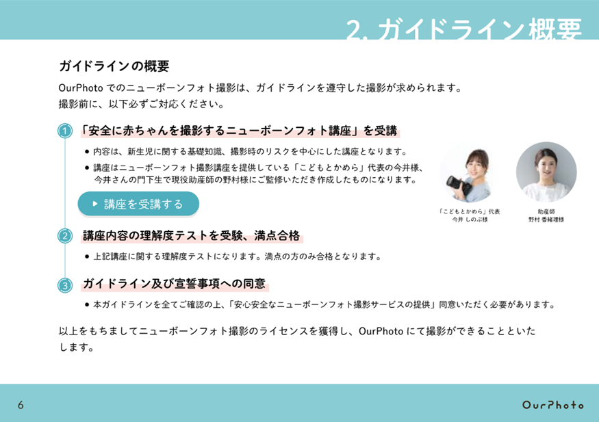 これにより、OurPhotoで「ニューボーンフォト」撮影を行うフォトグラファーは、産後間もないお母さんの心身の変化や新生児に関する基礎知識、「ニューボーンフォト」撮影に関するリスク・注意事項を解説した「安全に赤ちゃんを撮影するニューボーンフォト講座」を受け、受講後の理解度テストに満点合格、またOurPhotoが定める安全対策(宣誓事項)に同意し、「ニューボーンフォト」撮影のライセンス(※2)を取得することが必要となります。
