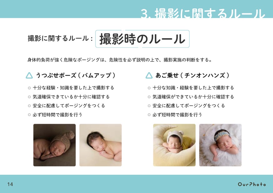 ニューボーンフォトの人気が高まる中で、生後間もない時期での撮影は赤ちゃんへの負担が大きいことから、撮影に不安を感じる方もいらっしゃいます。OurPhotoでは、写真を撮ってほしい個人と写真を撮りたいフォトグラファーをつなげる立場として、より安心安全な「ニューボーンフォト」の撮影体験を提供するための仕組みを考える責任があると考え、議論を継続的に重ねてまいりました。
