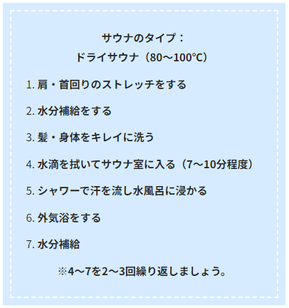 これらのことから、“どちらが良いか”というよりも、どちらがより自分のその時の体調に合っているかといった観点から取り入れていくことが重要です。ご自身の好みなども含め、サウナとお風呂双方を上手に活用していきましょう。