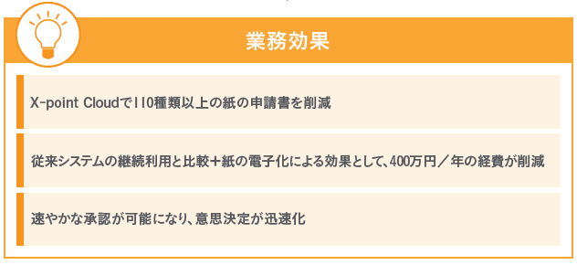 また、X-point Cloudが導入されたことで、これまで支店間などで申請書を回付するために運用していた紙の郵送はなくなり、以前まで外部パートナーに委託していた保守運用も一部を除いて内製化が実現したことから、保守運用費の削減につながっています。