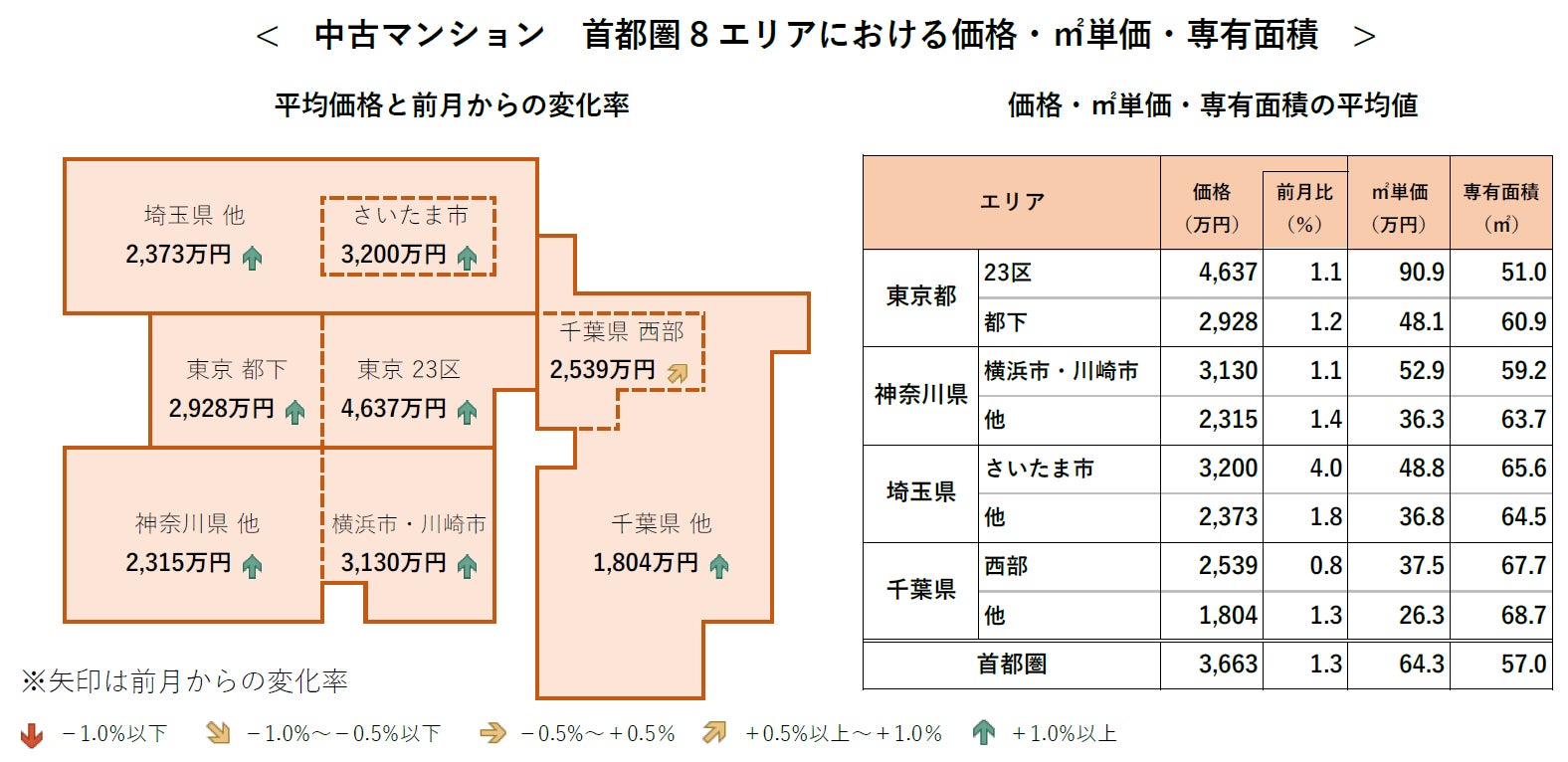 - 首都圏の中古マンション1戸あたり平均価格は3,663万円で、前月比+1.3%と上昇。