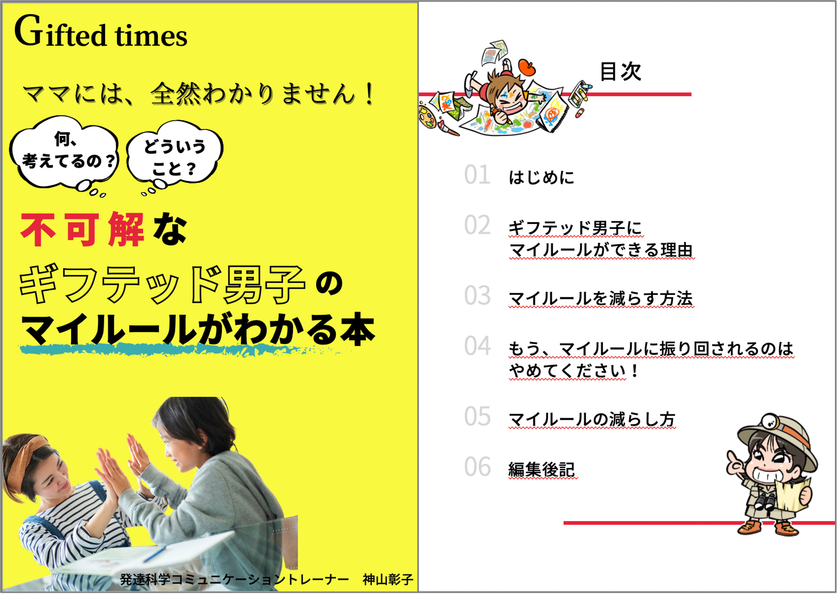 そこで、不可解なギフテッド男子のマイルールがわかる本と題しまして、不可解なギフテッド男子のマイルールができる理由とその減らし方を一冊の本にまとめました。この電子書籍でお伝えしている情報を活⽤し、⼀⼈でも多くの家族が笑顔で、子どもの才能を伸ばしていくお役に立てたら幸いです。