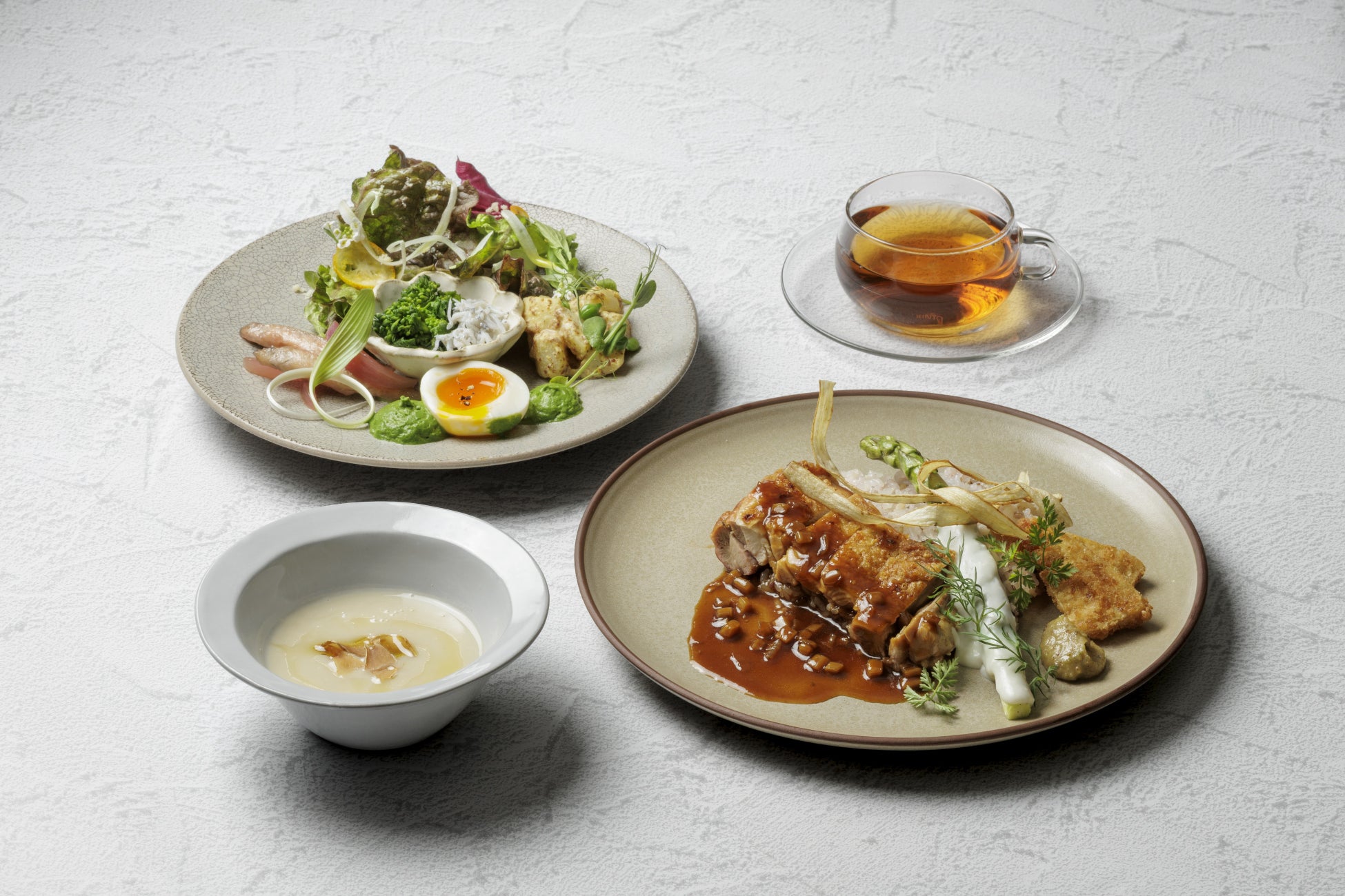 心と身体を健やかに整える、大満足の新しいランチセット。素材の旨みを活かした芳醇なサステナスープから始まり、春の息吹を感じる5種のデリ、そして炭火でじっくり香ばしく焼き上げた丹波どりと雑穀米のメインへと続く、三皿仕立ての彩り豊かなセットです。食後のドリンクとともに、最後の一口まで心身が喜ぶ充足感をお楽しみください。ご希望のお客様には、ヴィーガンメニューへの変更も承っております。