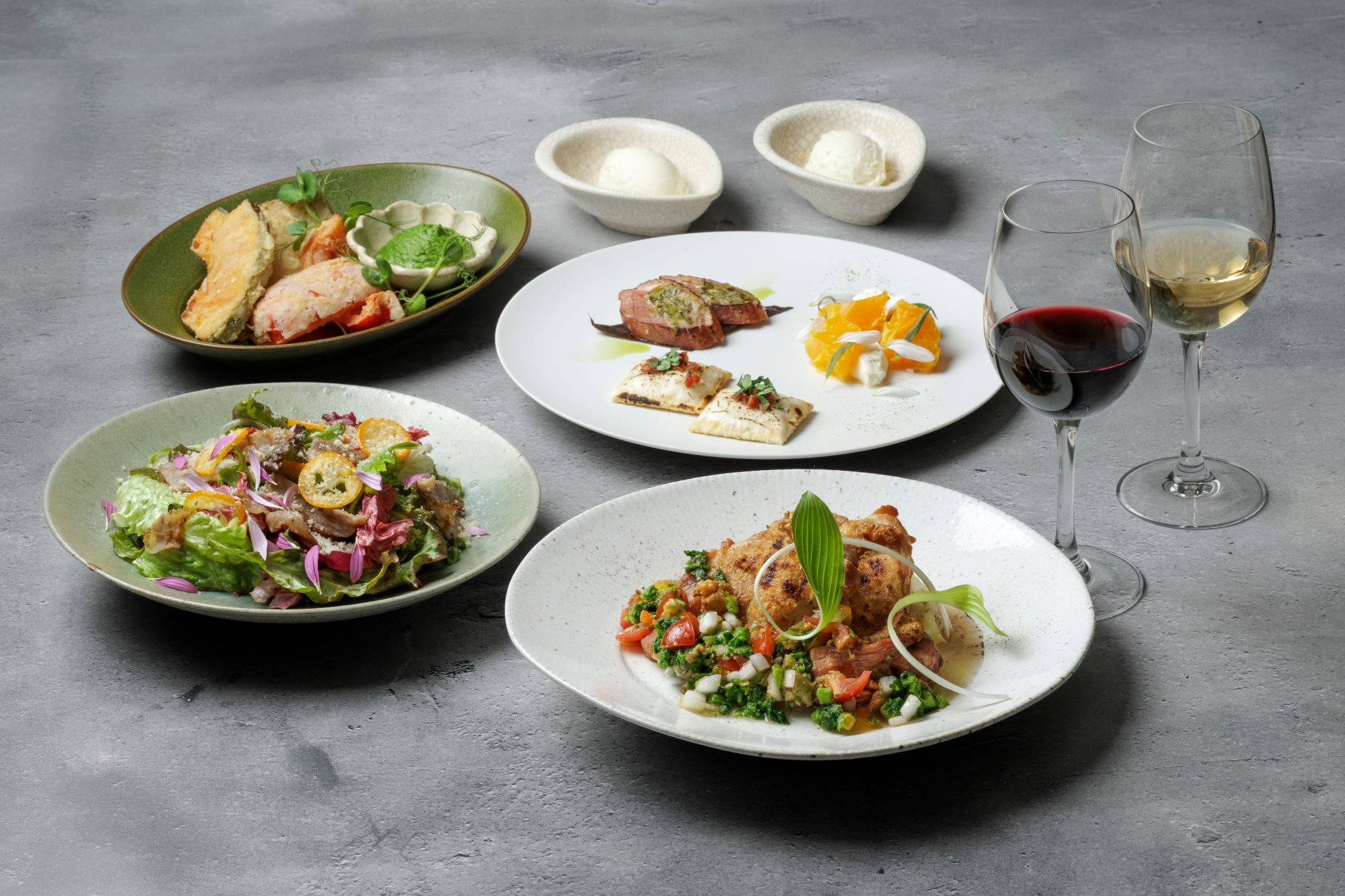 旬の食材をアクセントに、多彩な野菜をたっぷり取り入れたシェアスタイルのディナープラン。メインには炭火でじっくり焼き上げた丹波どりをご用意しています。