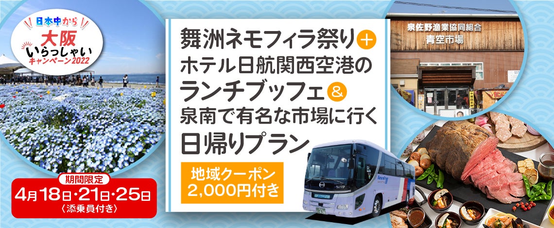 【4月18日・21日・25日限定大阪出発】《全国旅行支援》〈添乗員付き〉舞洲ネモフィラ祭り+ホテル日航関西空港のランチブッフェ&泉南で有名な市場に行く日帰りバスツアー