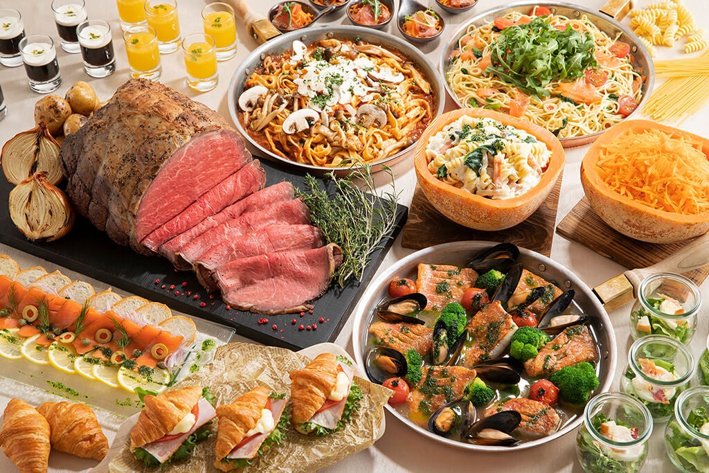 出来立ての料理を堪能いただけるオープンキッチンでは、ローストビーフや熱々のパスタ2種、魚料理をご用意。