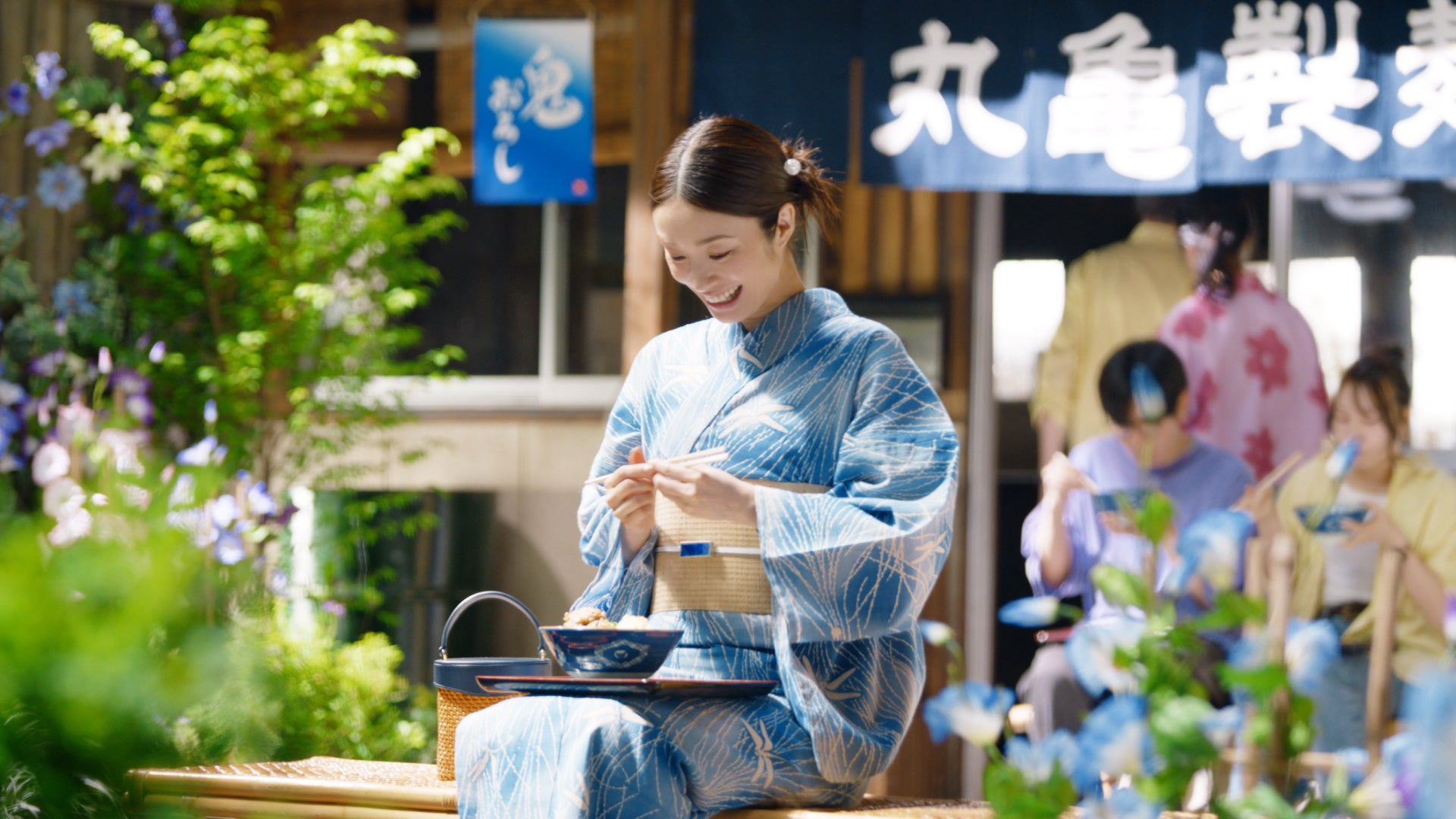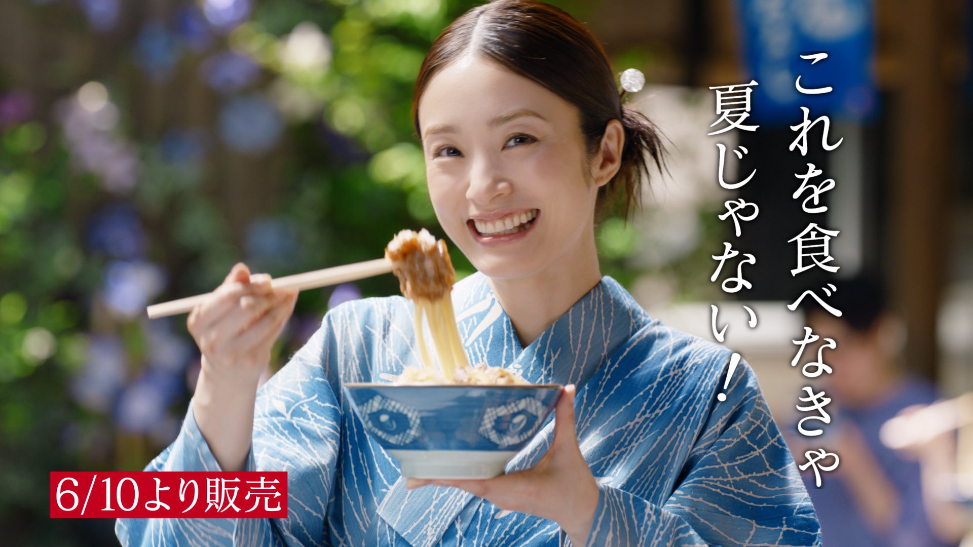 涼やかな水色の浴衣姿に身を包んだ上戸さんは、「これを食べなきゃ夏じゃない!」といったナレーションとともに、『鬼おろし肉ぶっかけうどん』と『鬼おろし豚しゃぶぶっかけうどん』をそれぞれつるっと一口。今年も「鬼おろしシリーズ」が食べられる!という喜びを上戸さんの食べっぷりで表現しています。そして最後にどさっと鬼おろしが盛り付けられた『鬼おろし肉ぶっかけうどん』と『鬼おろし豚しゃぶぶっかけうどん』でTVCMを締めくくります。