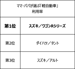 ママ・パパが選ぶ「軽自動車」買い物・子どもの送迎に利用、価格・燃費を重視/利用率第1位は「スズキ/ワゴンRシリーズ」、総合満足度第1位は「ホンダ/N-BOX」