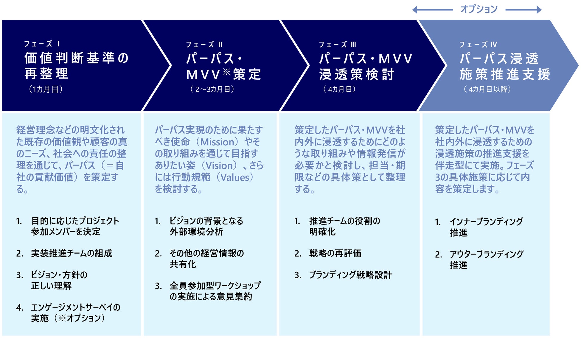 フェーズⅠでは、経営理念などの明文化された既存の価値観や顧客の真のニーズ、社会への責任の整理を通じて、パーパス(自社の貢献価値)を策定します。そして、フェーズⅡでは、パーパス実現のために果たすべき使命(Mission)やその取り組みを通じて目指すありたい姿(Vision)、行動規範(Values)を検討します。