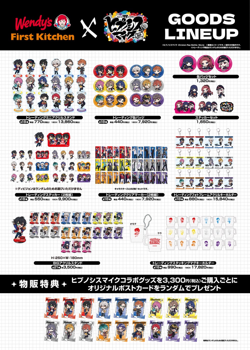 ウェンディーズ・ジャパン株式会社及び、ファーストキッチン株式会社(所在地:東京都新宿区、代表取締役:紫関修)は6月3日(火)より、ウェンディーズ・ ファーストキッチンとファーストキッチン(競馬場店を除く)で、映画『ヒプノシスマイク -Division Rap Battle-』とのコラボキャンペーンを開催します。コラボを記念して、ヒプノシスマイクのメンバーたちを描き起こした、「ミニクリアファイル」とお好きなフレーバーポテトMセット780円(税込)を7月6日(日)までの期間中、数量限定で販売します。数に限りがありますのでお早めにご来店ください。また、5店舗限定でコラボメニュー、コラボグッズなど盛りだくさんの内容を実施します。ぜひヒプノシスマイクの世界観をお楽しみください。