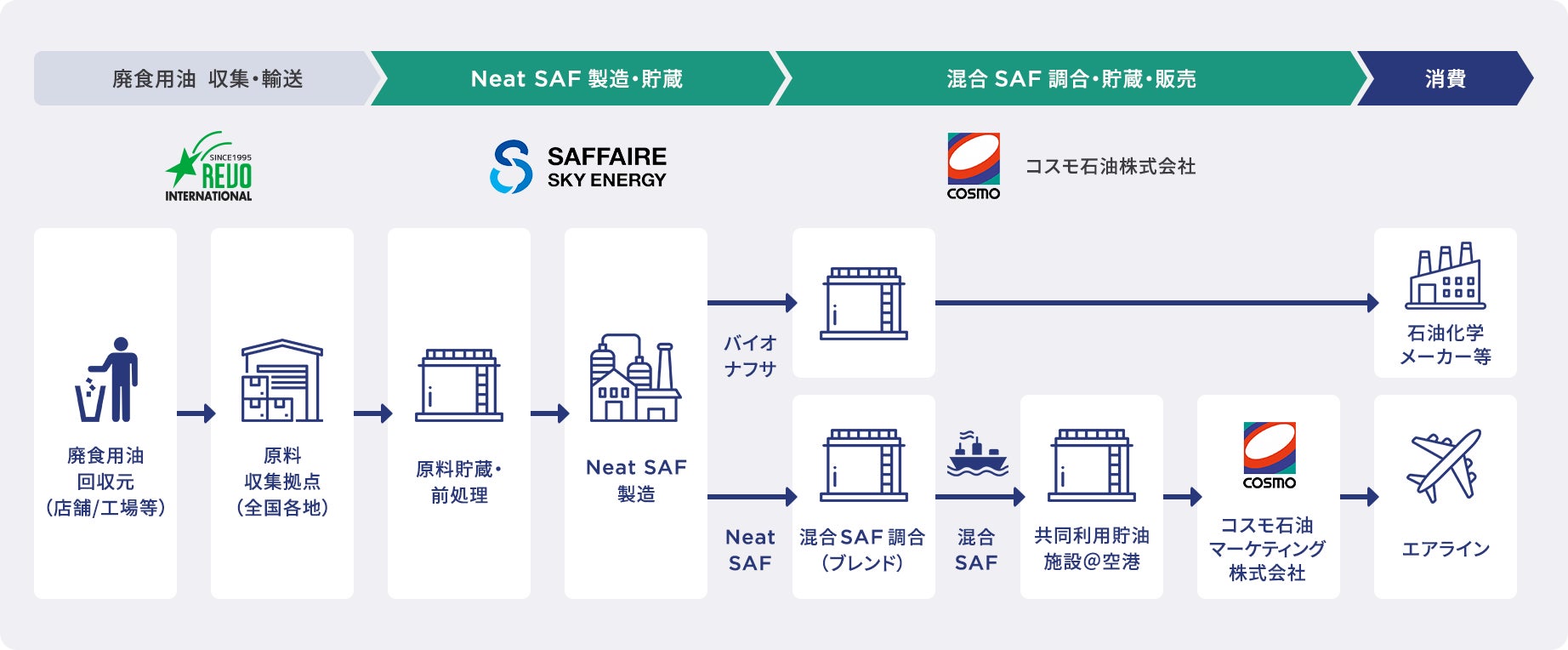 レボインターナショナルは廃食用油の収集事業者としてISCC CORSIA/ISCC EU認証を、コスモ石油などはSAFの混合および販売をする事業者としてISCC CORSIA/ISCC EU認証を取得済みで、このたびのSAFFAIRE SKY ENERGYの取得により、廃食用油を原料とする国産SAF大規模生産事業に関わる一連の企業が、本認証を取得したこととなります。