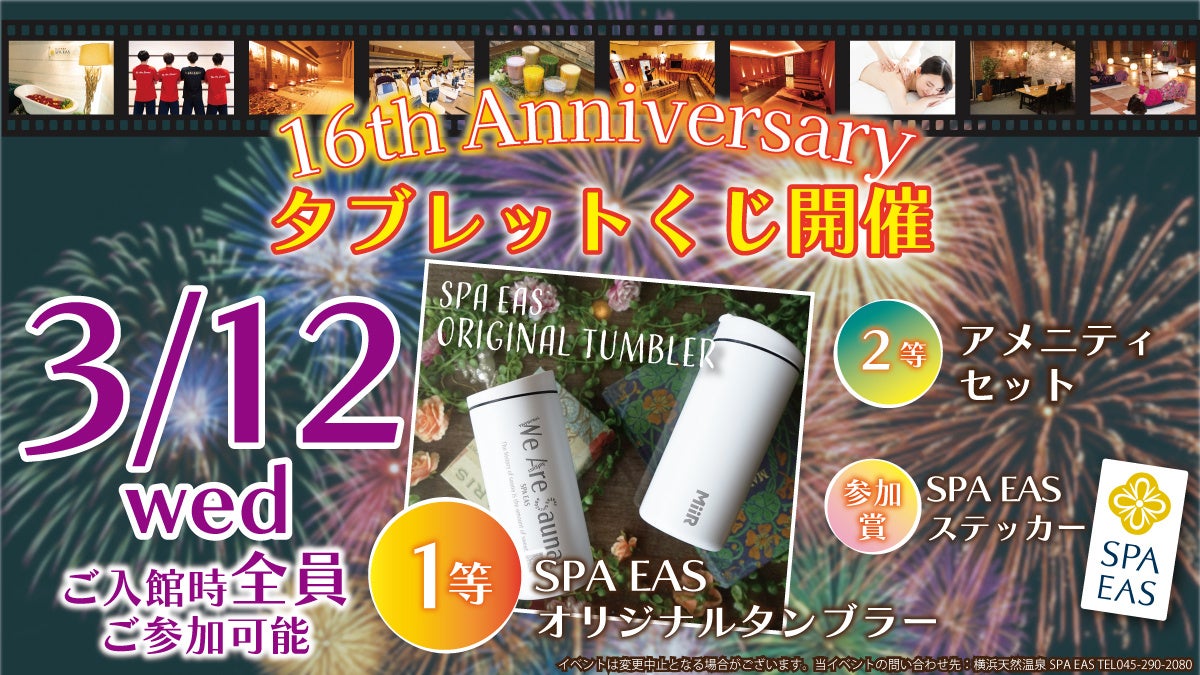 横浜天然温泉SPA EAS16周年記念日である3月12日(水)は、来館者様全員ご参加いただけるタブレットくじを開催いたします。横浜天然温泉SPA EASオリジナルタンブラーやアメニティセット、ロゴステッカーが当たるはずれなしの内容です。