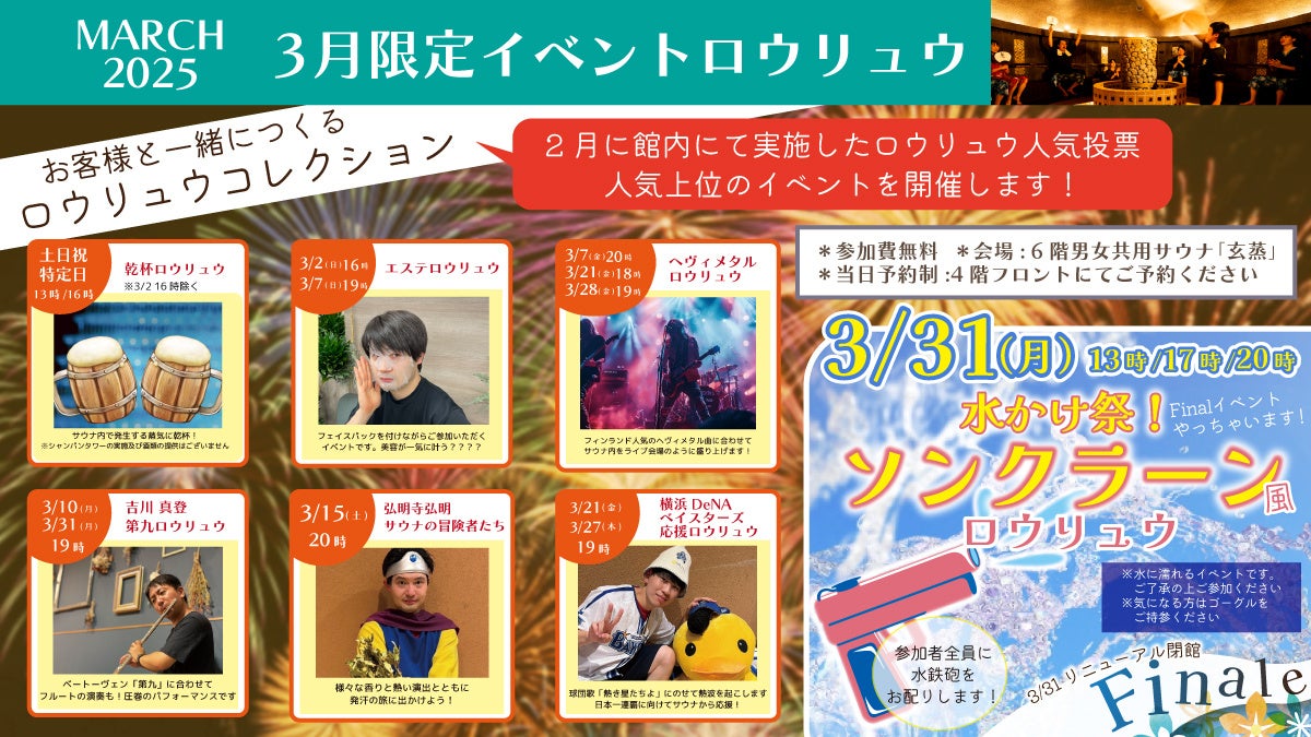 【乾杯ロウリュウ】3月土日祝日および特定日…13時/16時