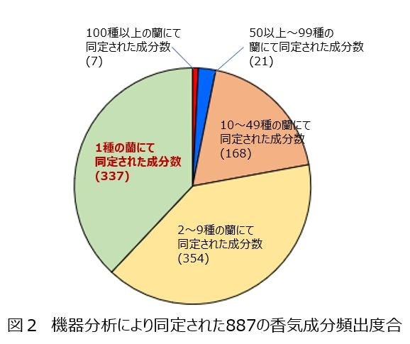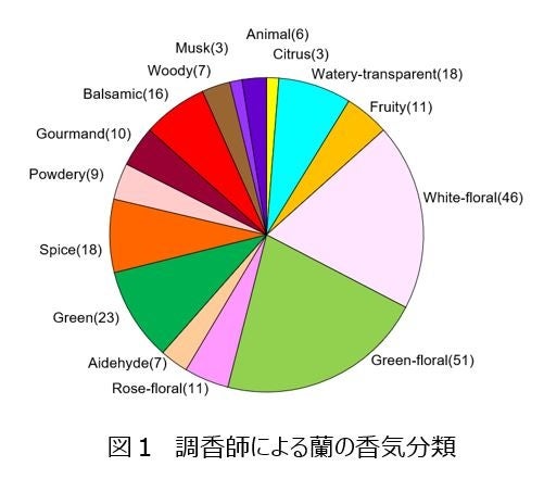 調香師による香調解析では、対象となる蘭の香りは、柑橘類を彷彿させる香りやフローラルな香りから、スパイシーな香り、グルマン調の香り、アニマリックな香りまで幅広く、15種もの香調に分類できることが明らかになりました(図1)。 さらに、遺伝的に近縁の種であっても香りは多様で、進化とともに香りがダイナミックに変化していることがわかりました。