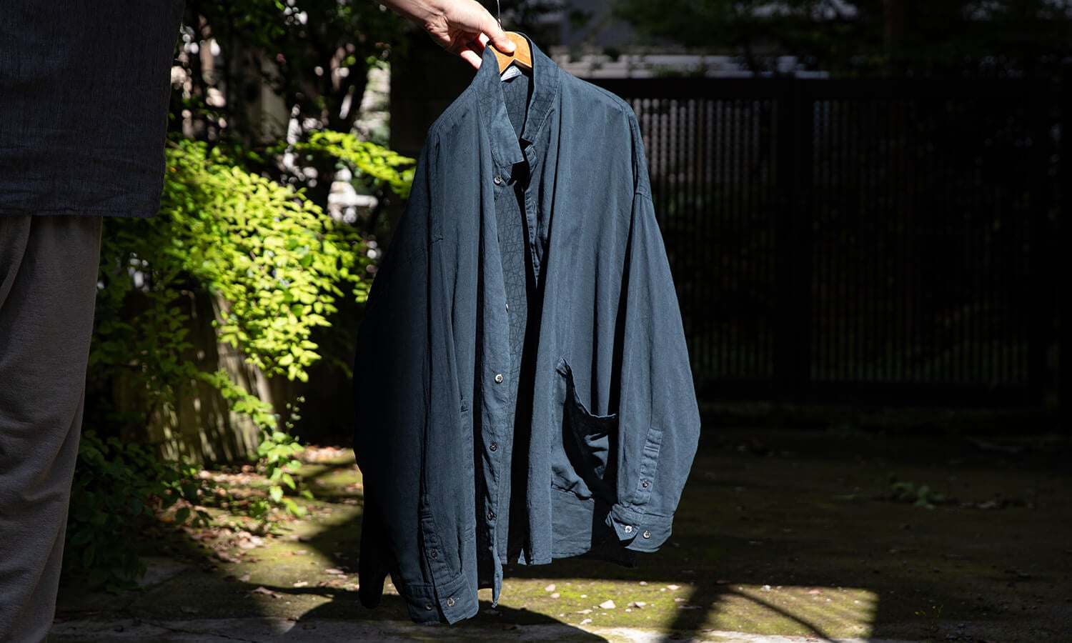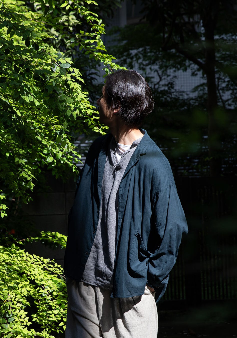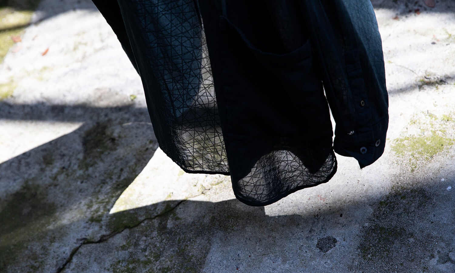 光にかざすと透けるものの、立体感のある織り柄や、製品染めによる濃色により着用時に目立つほどではございません。風が抜ける軽やかな着心地を存分に感じていただけます。