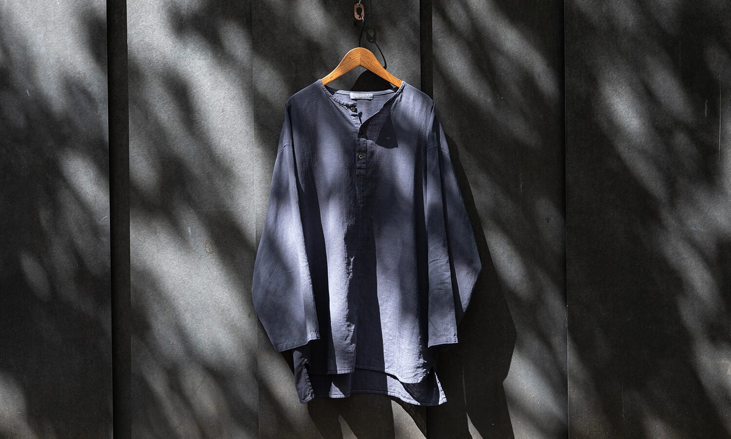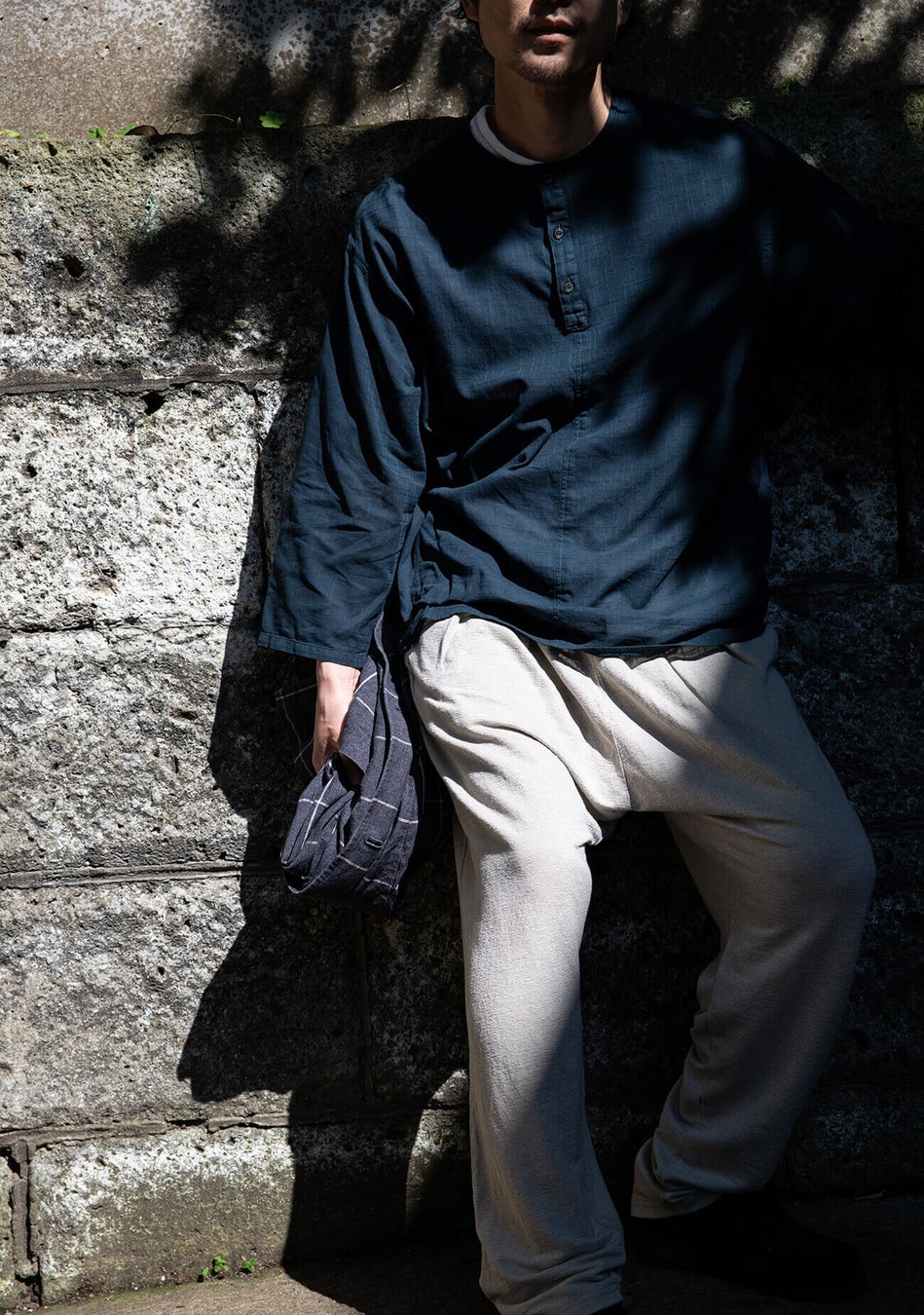 ヘンリーネックのプルオーバー。それで手元が開放されたクロップドスリーブです。日照りの強い日は、手元まで覆い被せ、暑い日は袖捲り。風通りは抜群なので、蒸れることなく着用いただけます。