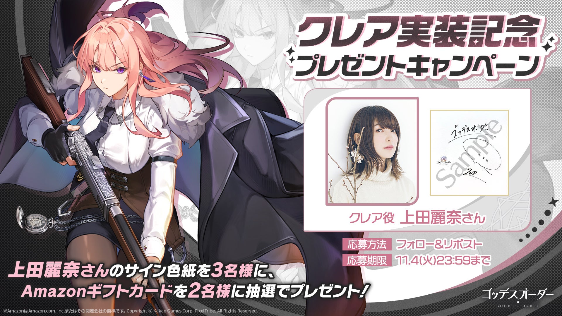 爽快アクションRPG『ゴッデスオーダー(Goddess Order)』メインストーリー7章「狂気の根底」を実装!新規キャラクター「クレア」役の声優「上田麗奈」のサイン色紙が当たるXキャンペーンも!