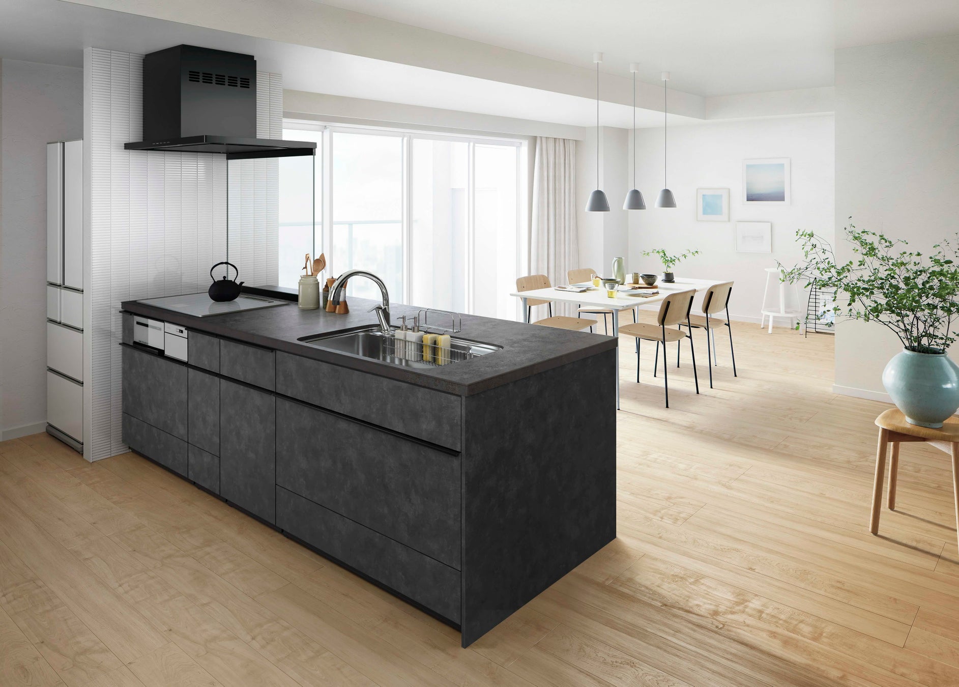 熱にも傷にも汚れにも強く、美しさを長く保てる理想的なワークトップのセラミックトップやタッチレス水栓、フロントオープン食洗器、使いやすさと収納量を両立した「らくパッと収納」などを標準装備しています。