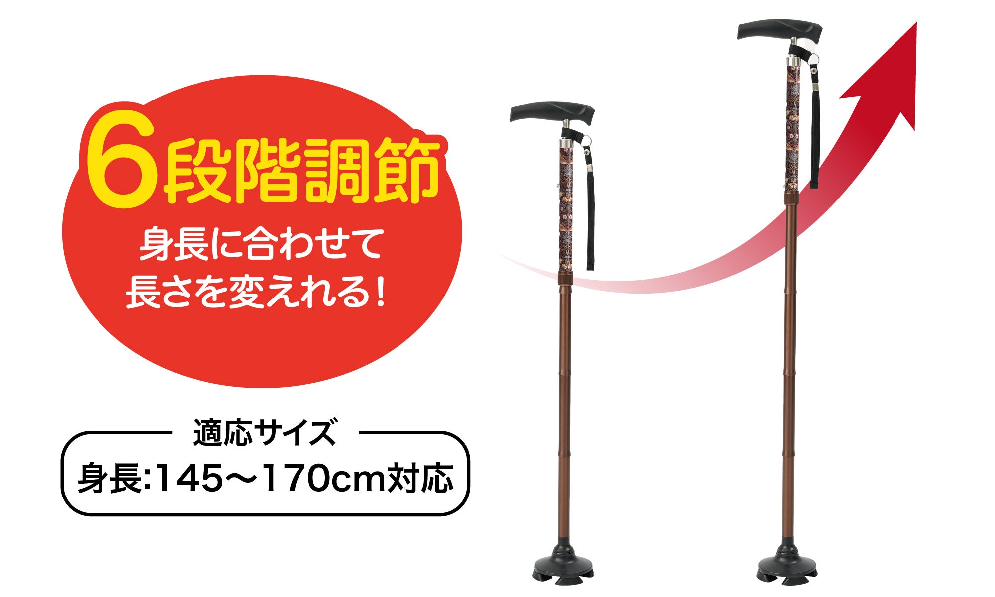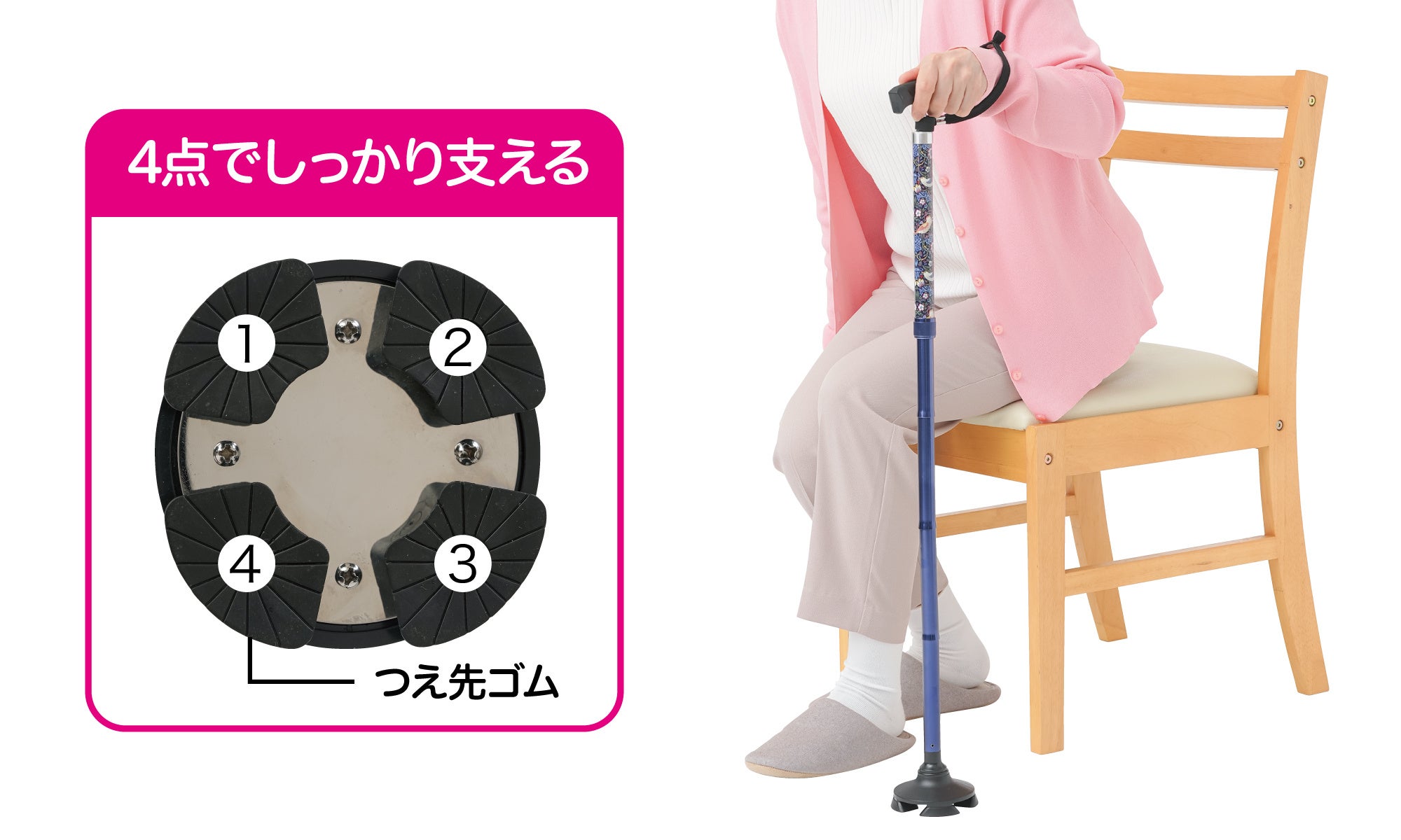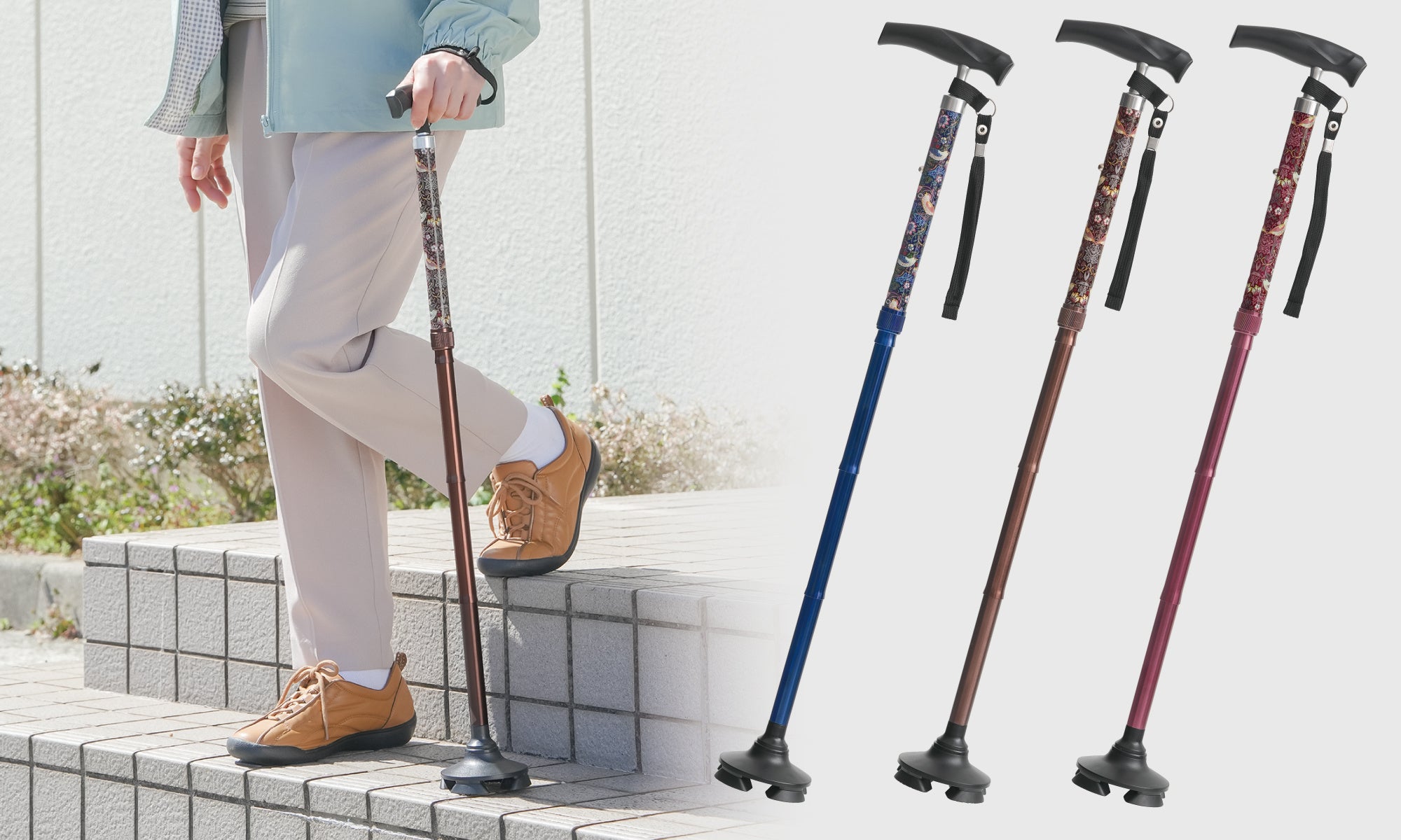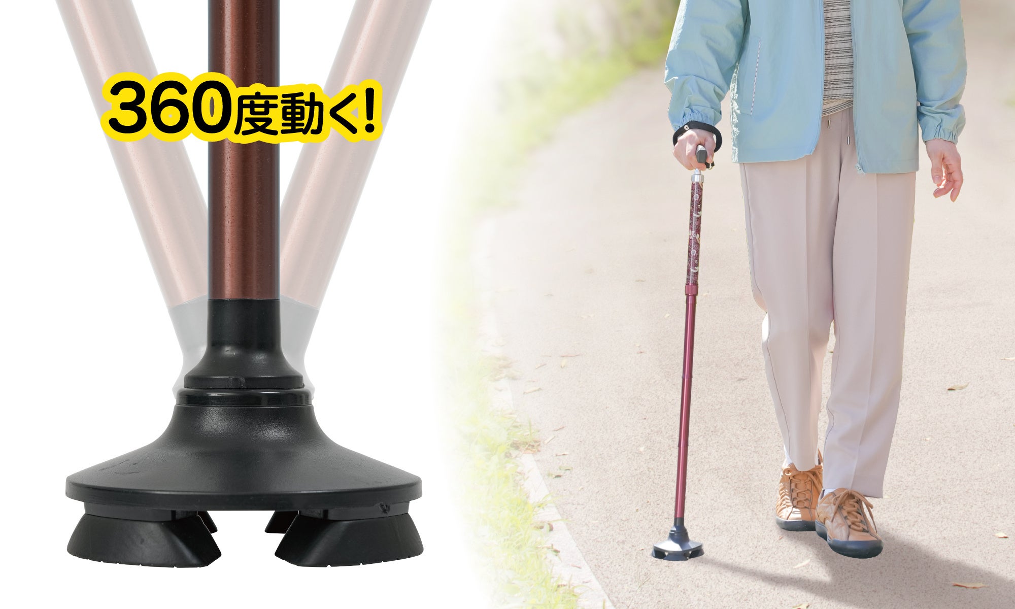 ステッキの先端が360°動くので、坂道や階段なども安定した体重移動ができ快適な歩行をサポートします。