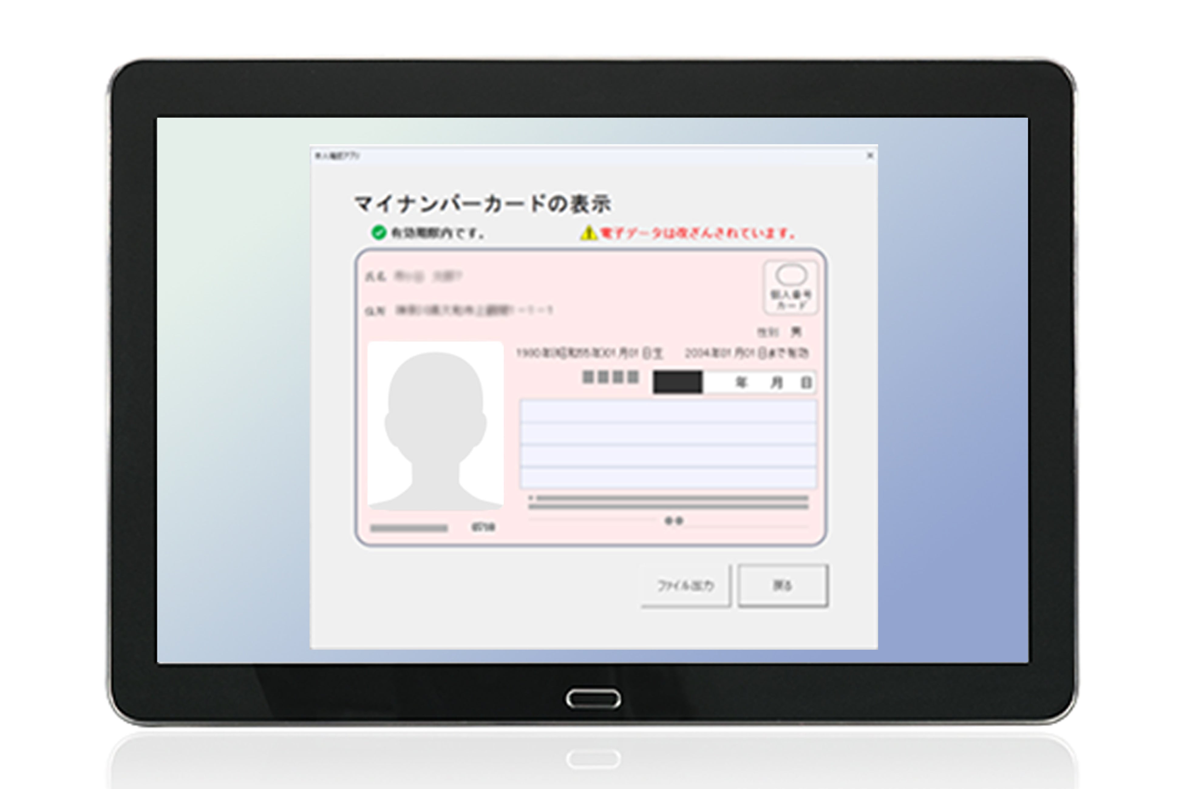ICチップ内に保存された顔画像や氏名情報をPC画面上に表示します。窓口対応者がマイナンバーカードや運転免許証上に掲載された写真と来訪者本人を目視で照合することで、写真の張り替えなどの券面の偽造による「なりすまし」を発見できます。