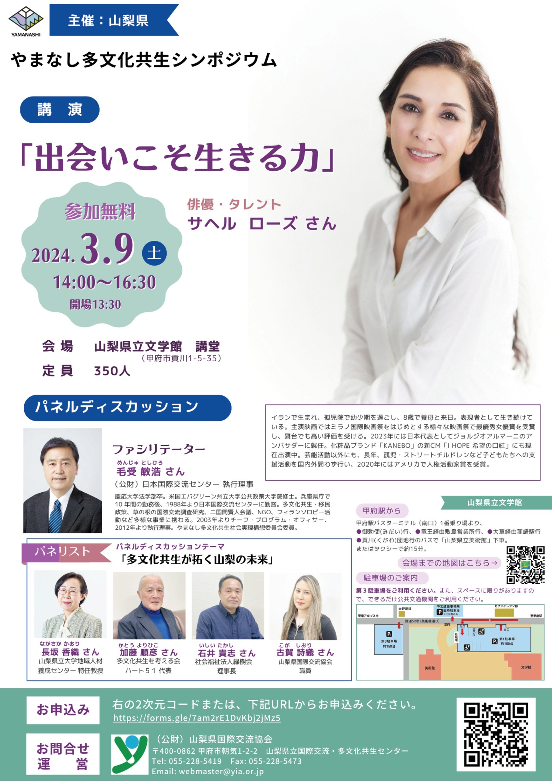 シンポジウムでは、イランで生まれ、8歳の時に来日した俳優・タレントのサヘルローズ氏による講演、「多文化共生が拓く山梨の未来」と題した有識者によるパネルディスカッションを行います。