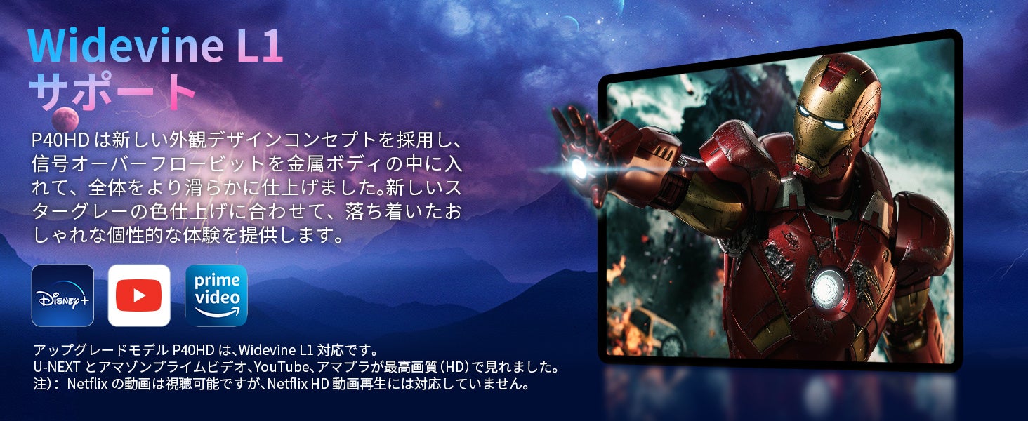 P40HDは新しい外観デザインコンセプトを採用し、信号オーバーフロービットを金属ボディの中に入れて、全体をより滑らかに仕上げました。10.1インチのIPSディスプレイを搭載し、1920×1200の解像度を備えて、超広視野角を持ちます。16:10ゴールドスケールと合わせて、ドラマや映画の観賞にも、ゲーム体験にも非常に快適です。ブルーライトカットモード、読書モードなどと一緒に使用することで、長時間使用しても疲れません。