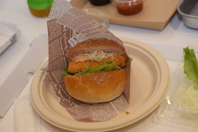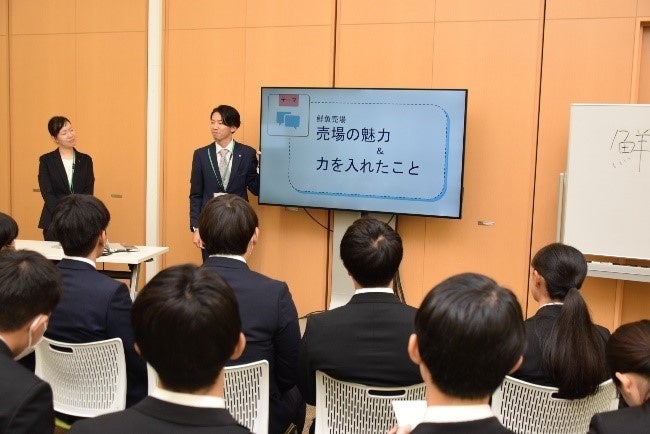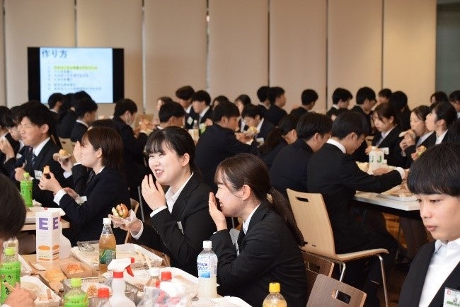 内定者同士の親睦・コミュニケーションの促進や、平和堂についてもっと知ってもらうために、全員が集合して執り行いました。内定式後は、内定者が自分で加工したバーガーを食べることで、平和堂の商品への興味・理解を深めてもらいました。また、午後からは先輩社員がそれぞれの売場の特徴や仕事内容を伝える売場説明会を行い、内定者が安心して平和堂に入社できるよう研修を行いました。