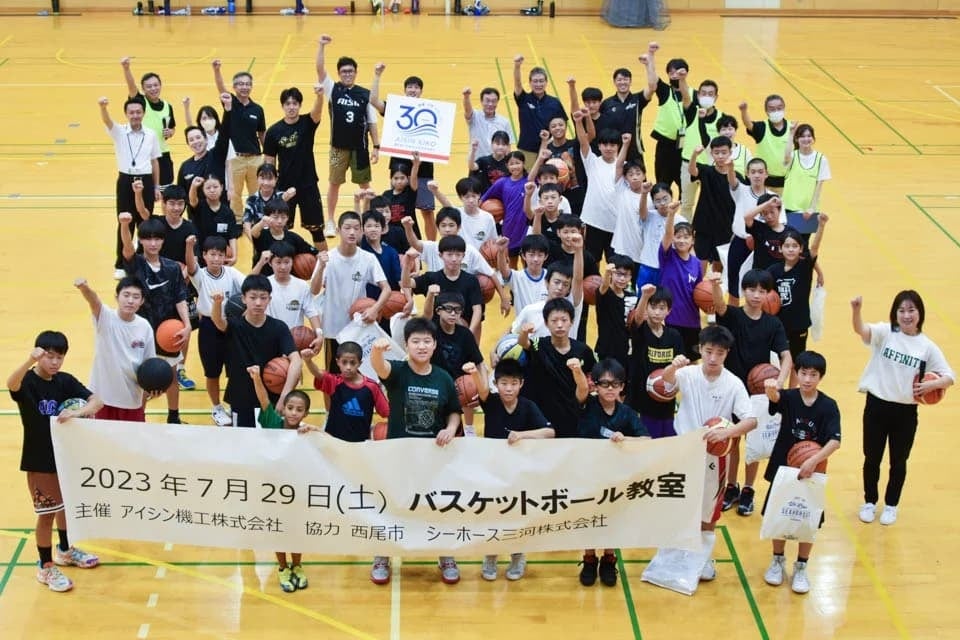 今回のバスケットボール教室は、コーポレートパートナーであるアイシン機工株式会社の創立30周年記念事業の一環として、シーホース三河が講師を派遣し開催いたしました。