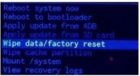 Step2:リカバリーモードが起動したらAndroidの音量ボタンを押して「Wipe data/factory reset」を選び、電源ボタンを押します。