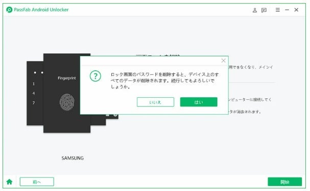Step3:「ロック画面のパスワードを削除すると、デバイス上のすべてのデータが削除されます。続行してもよろしいでしょうか。」と表示さるので問題がなければ「はい」をクリックします。