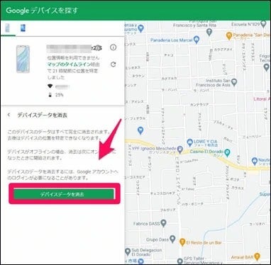 Step2:Androidを選択して「デバイスデータを消去」を選択します。