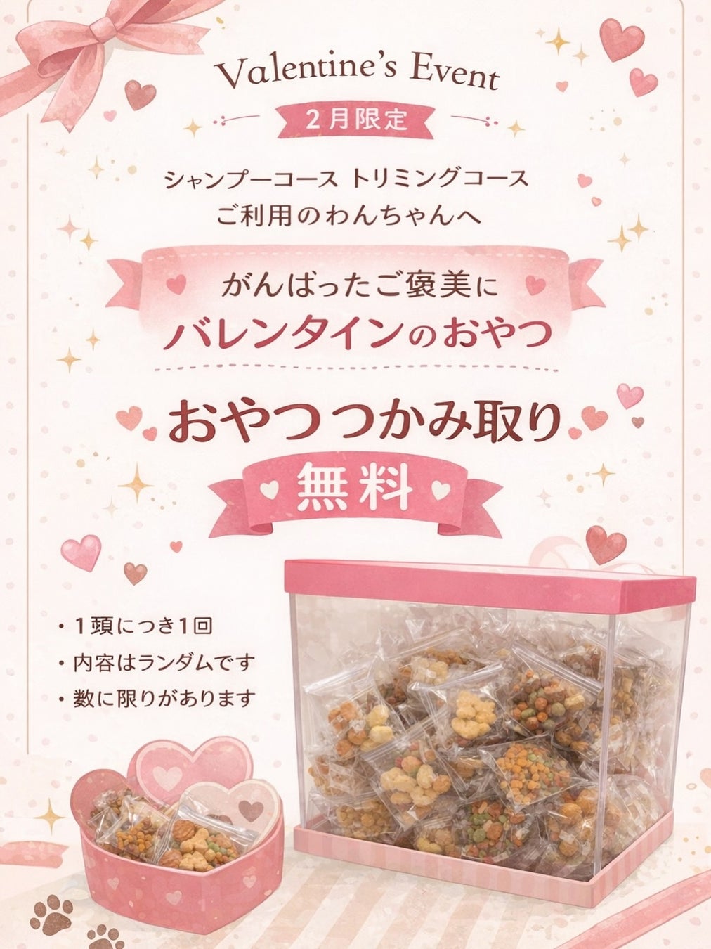 Pets Tokyo西大井店では、2月1日〜28日の期間中、シャンプーコース・トリミングコースご利用で“おやつのつかみ取り”に無料でご参加いただけます。いつもお買い上げいただいている飼い主様はもちろん、まだ試したことのない飼い主様も、この機会に是非 "愛犬の好き" を見つけてみてはいかがでしょうか?