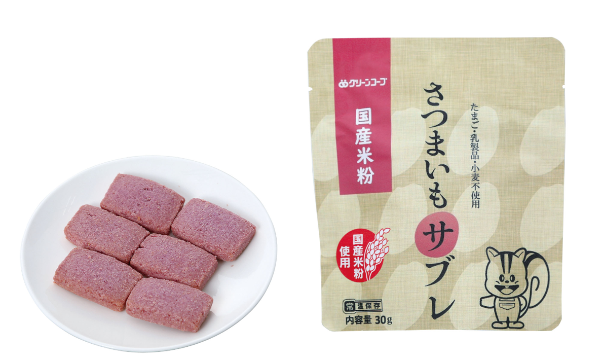 グリーンコープの離乳食「BabyGreen」の原料メーカーの一つ三笠産業株式会社のムラサキ芋パウダーと焼き芋パウダーを使用。薬剤を使わずに独自製法の蒸し焼き工程を行うことで、えぐみを減らして野菜本来の味わいや食物繊維を残しています。さつまいものほくほくとした風味が米粉サブレのおいしさを引き立てます。