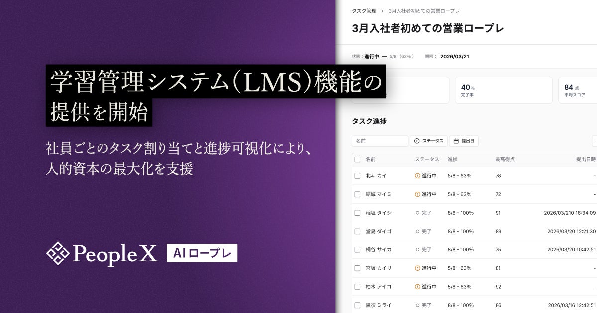 採用から活躍支援まで、AIで人事課題を解決する株式会社PeopleX(本社:東京都新宿区、代表取締役CEO:橘 大地、以下:当社)は、当社が提供する対話型AIロープレサービス「PeopleX AIロープレ」について、新たに学習管理システム(LMS)機能の提供を開始したことをお知らせいたします。本機能は、個々のロールプレイングを社員ごとにタスクとして割り当て、進捗や履歴を一元管理することができるものです。これにより、管理職の負担を大幅に軽減しながら、社員一人ひとりの能力を効果的に向上させる環境づくりを支援します。