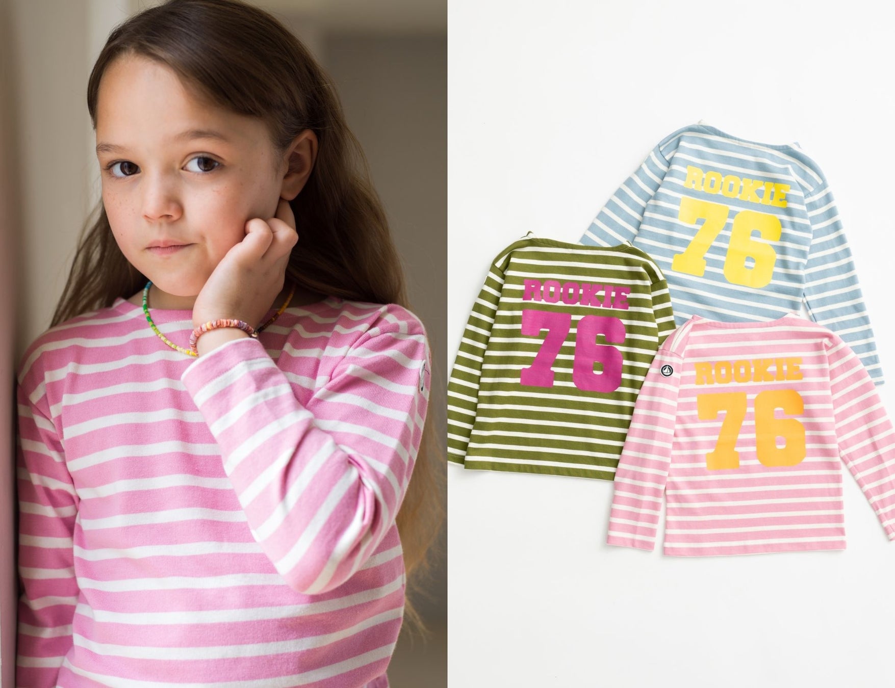 今回、ブランドを象徴するマリニエールボーダーのプルオーバーをベースにユニフォームからインスピレーションを得たデザインで登場。ロンハーマン創業の1976年にちなみ、「76」とこれからの未来をつくる子どもたち「ROOKIE」の文字をバックにプリントを施したスペシャルピースが完成しました。