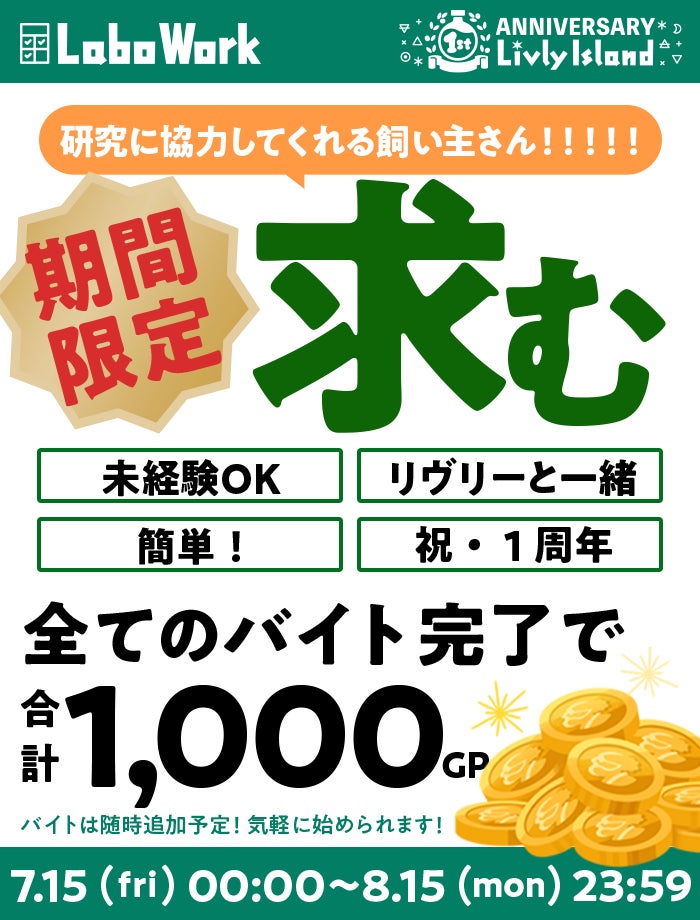 期間限定のラボワークですべてのバイトを完了すると、報酬として1,000GPを獲得できます。ぜひ研究にご協力ください。
