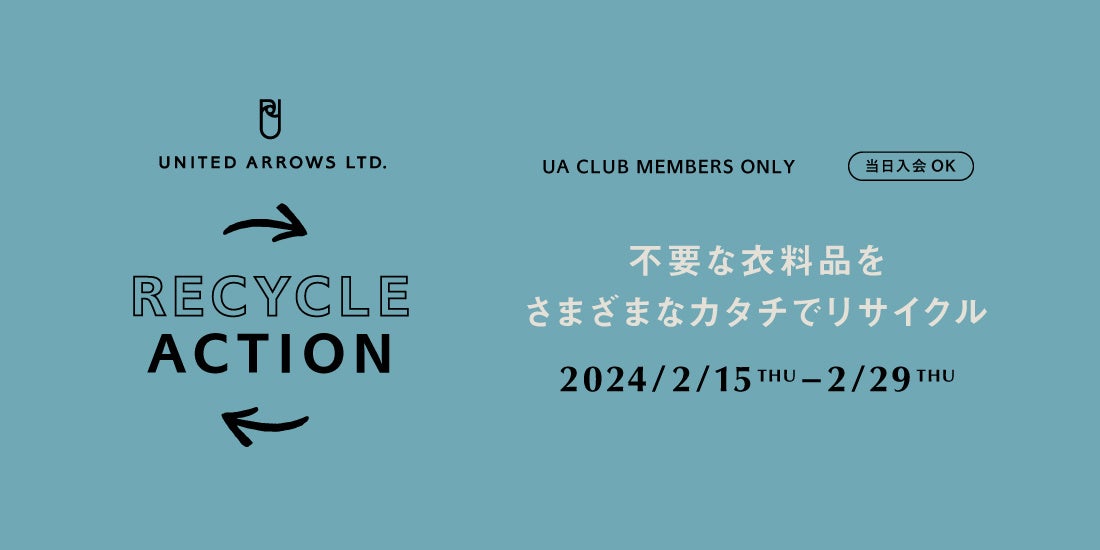 株式会社ユナイテッドアローズ(代表取締役 社長執行役員 CEO: 松崎 善則、本社所在地:東京都渋谷区)は、サステナビリティ活動「SARROWS(サローズ)」(※)の取り組みとして、不要となった衣料品を回収しさまざまなカタチでリユースやリサイクルにつなげる「UA RECYCLE ACTION(UAリサイクル アクション)」を開催します。2024年2月15日(木)~29日(木)の間、当社の全国各ブランドの店舗(アウトレット店舗等一部除く)にて衣料品の回収を承ります。回収した衣料品は、株式会社ECOMMIT(エコミット)の資源循環サービス「PASSTO(パスト)」を通して、国内外でリユースされるほか、新たな資源として生まれ変わります。
