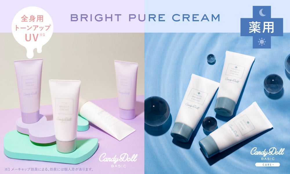 誰でも白肌(※1)を叶えるCandyDollのブライトピュアシリーズから、SPF値がUPした、1本で紫外線カットもトーンアップ&肌補正(※1)もできるボディ用トーンアップUVと、ブランド初の薬用タイプで素肌からの美白(※2)ケアが叶う全身用ケアクリームの2商品が登場します。