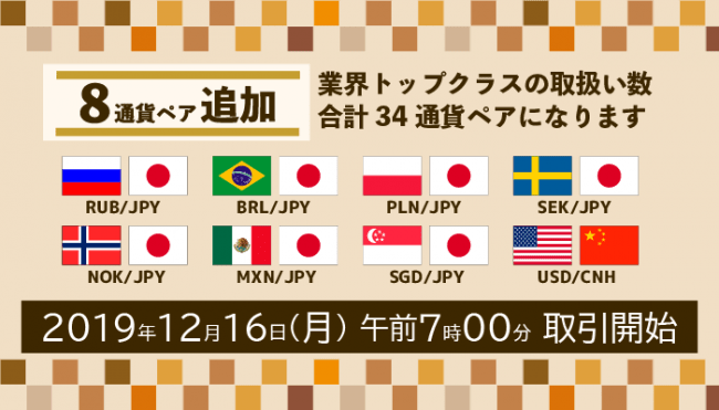 本日よりお客さまよりご要望の多かった「ロシアルーブル/円」、「ブラジルレアル/円」、「メキシコペソ/円」をはじめとした対日本円の通貨ペアを中心に通貨ペアを拡充致しました。取扱通貨ペアは8通貨ペア追加され、合計34通貨ペアとなり、業界トップクラスの取扱数となります。(2019年12月13日当社調べ)