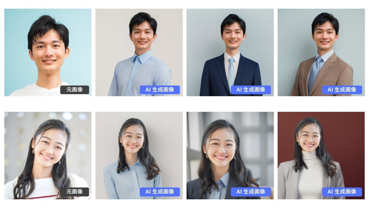 顔がはっきりと映っている写真を一枚選び、アップロードするだけで、女性・男性の様々なスーツ・正装姿の本格的なビジネス写真を AI により生成することができます。一度に最大80枚まで作成することができます。