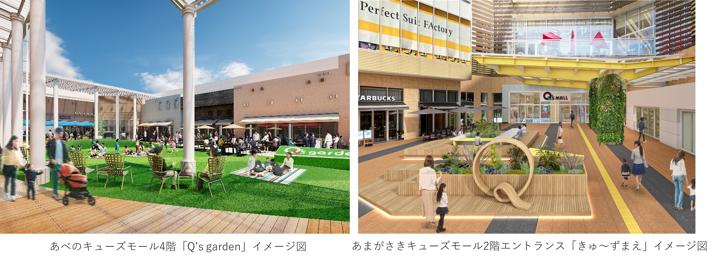また、大阪3大ターミナルに位置するあべのキューズモールの4階屋外空間に「Q’s garden」をオープンし、エリアにおいて希少なつどい、くつろげる庭が誕生します。あまがさきキューズモールの2階エントランスでは、施設の顔となり、待ち合わせスポットにも最適な「きゅ~ずまえ」が誕生し、よりくつろぎを感じられる心地よい施設へと進化します。