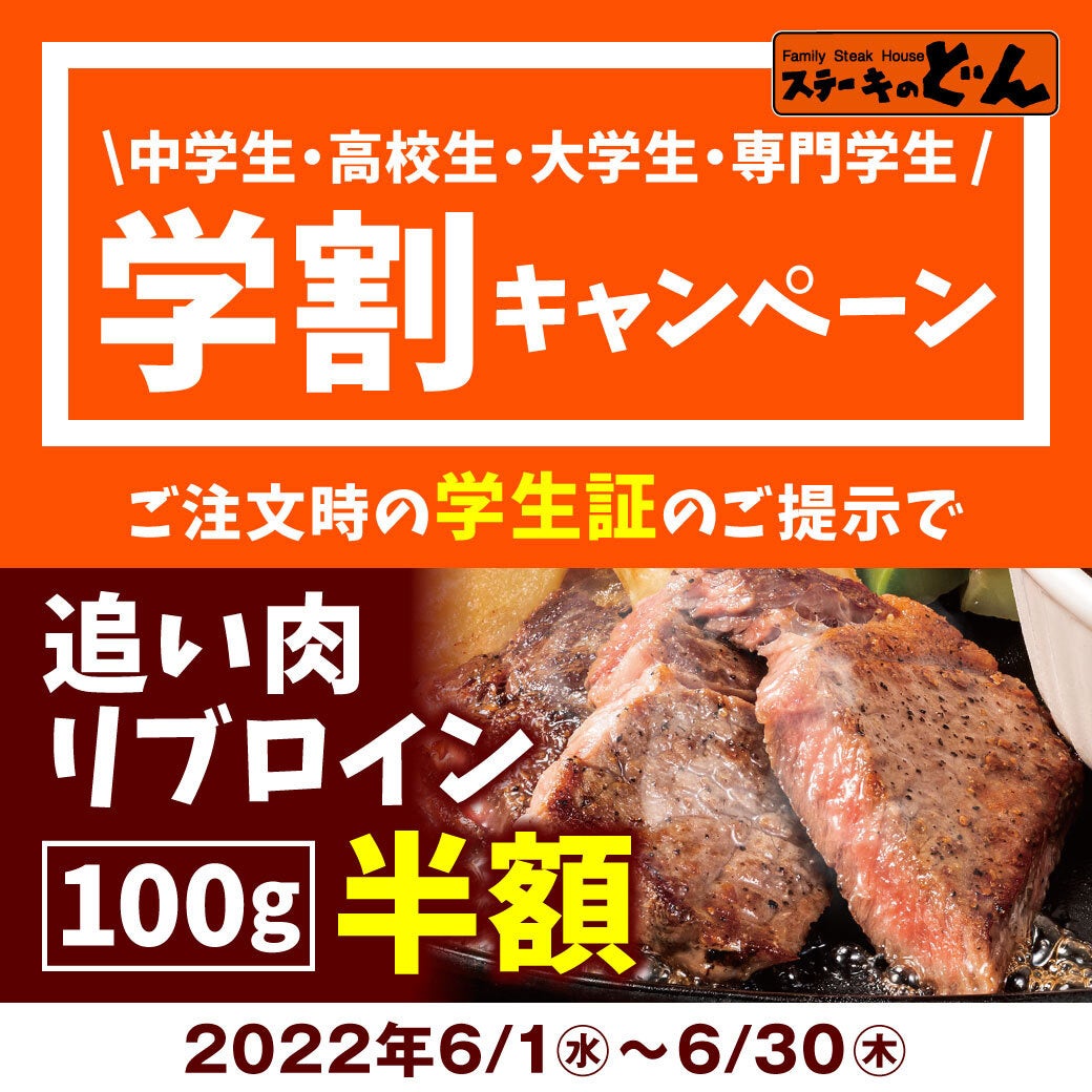 「ステーキのどん」では2022年6月1日(水)より全国58店舗で《学割キャンペーン【追い肉】半額》を実施いたします。